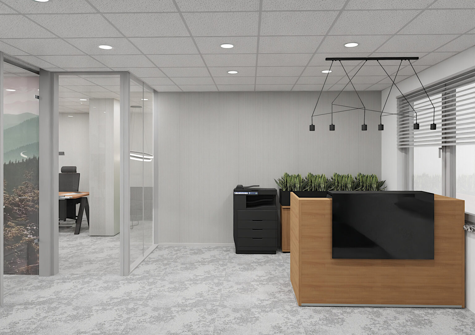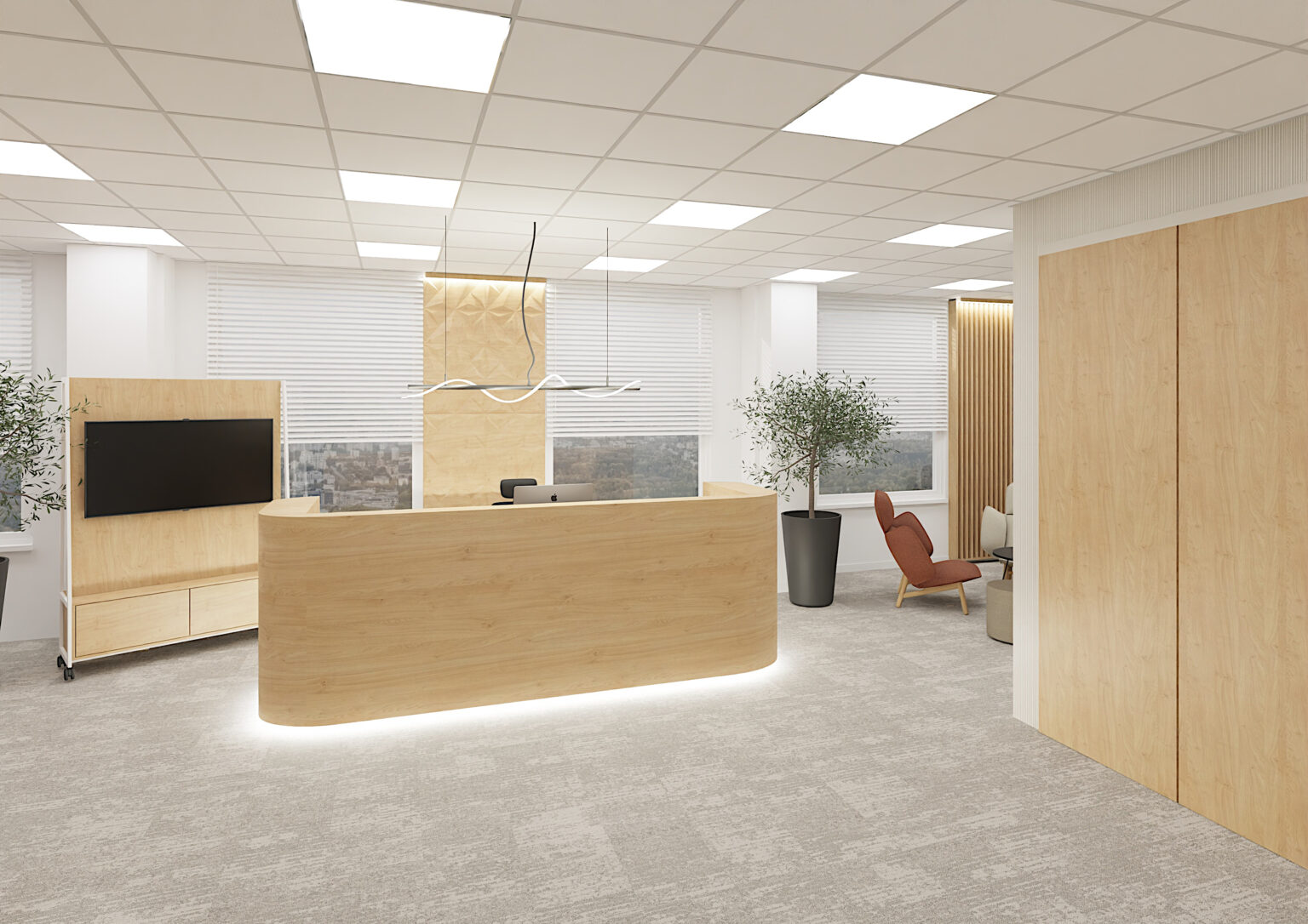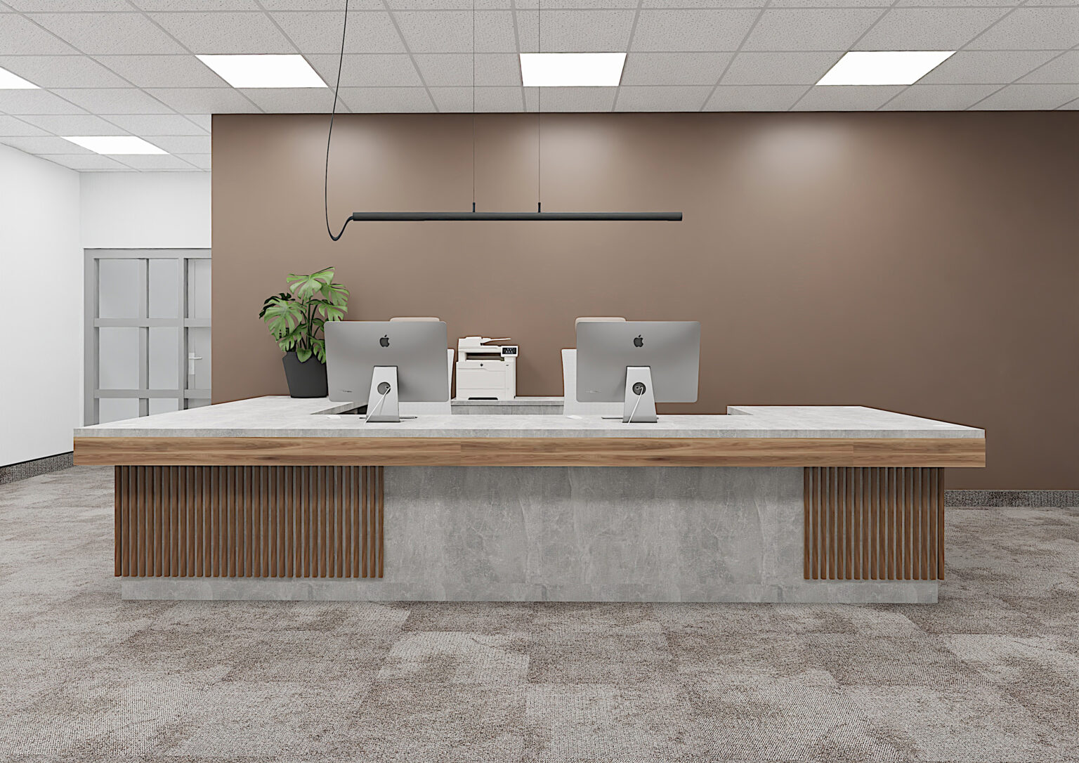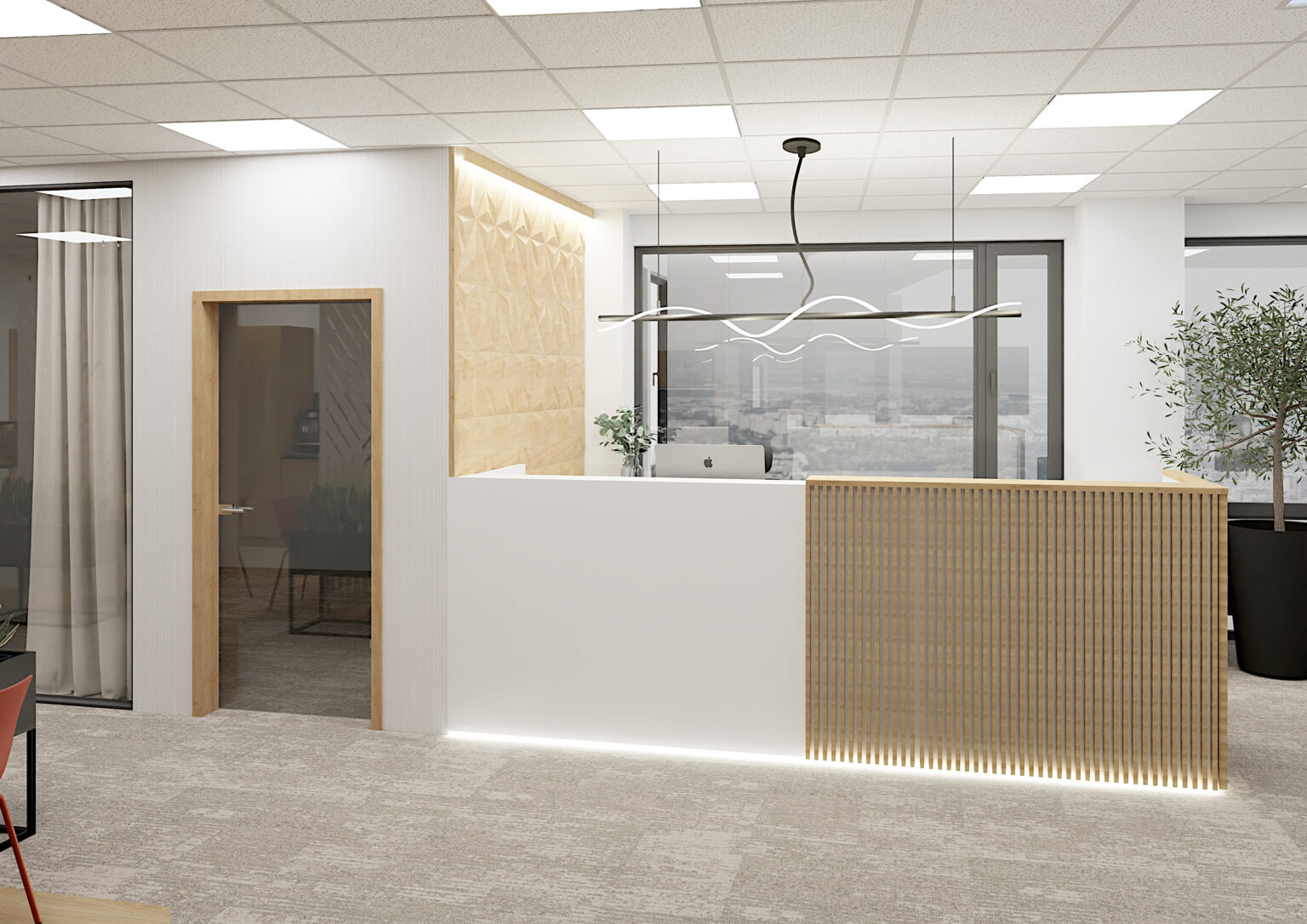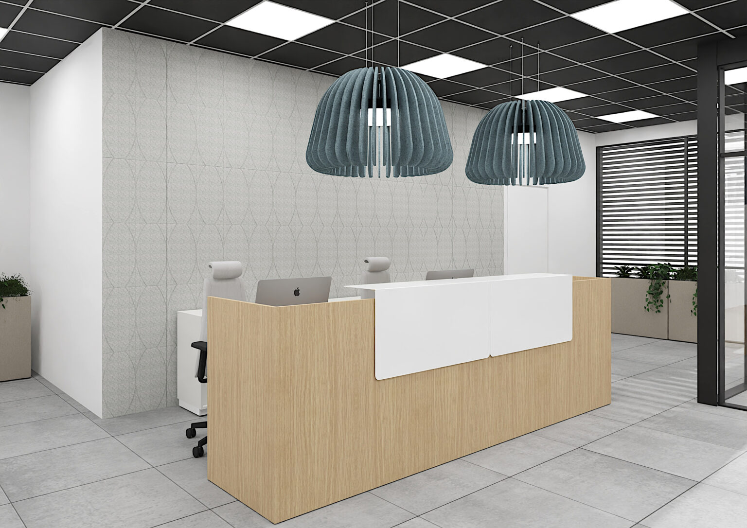 Recepcja to kluczowy element biura — jej design musi być spójny z identyfikacją wizualną firmy, kolorystyką, materiałami i stylem. Dobre pierwsze wrażenie buduje zaufanie.