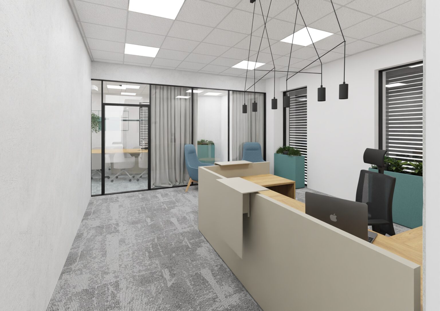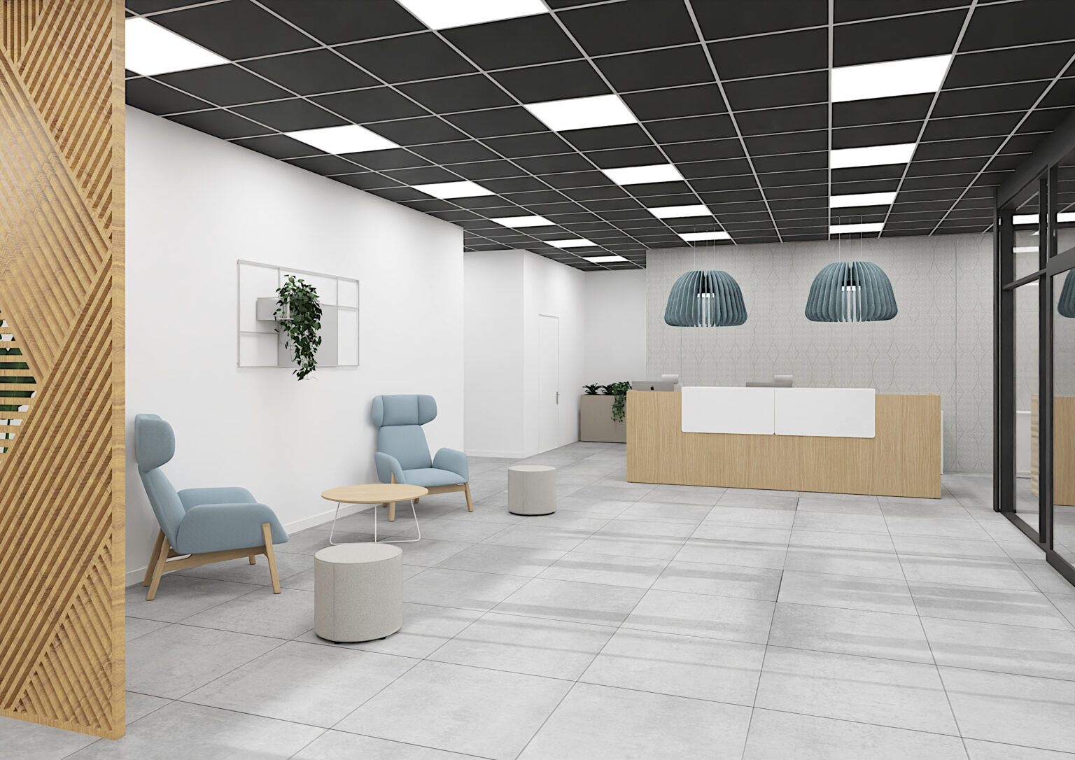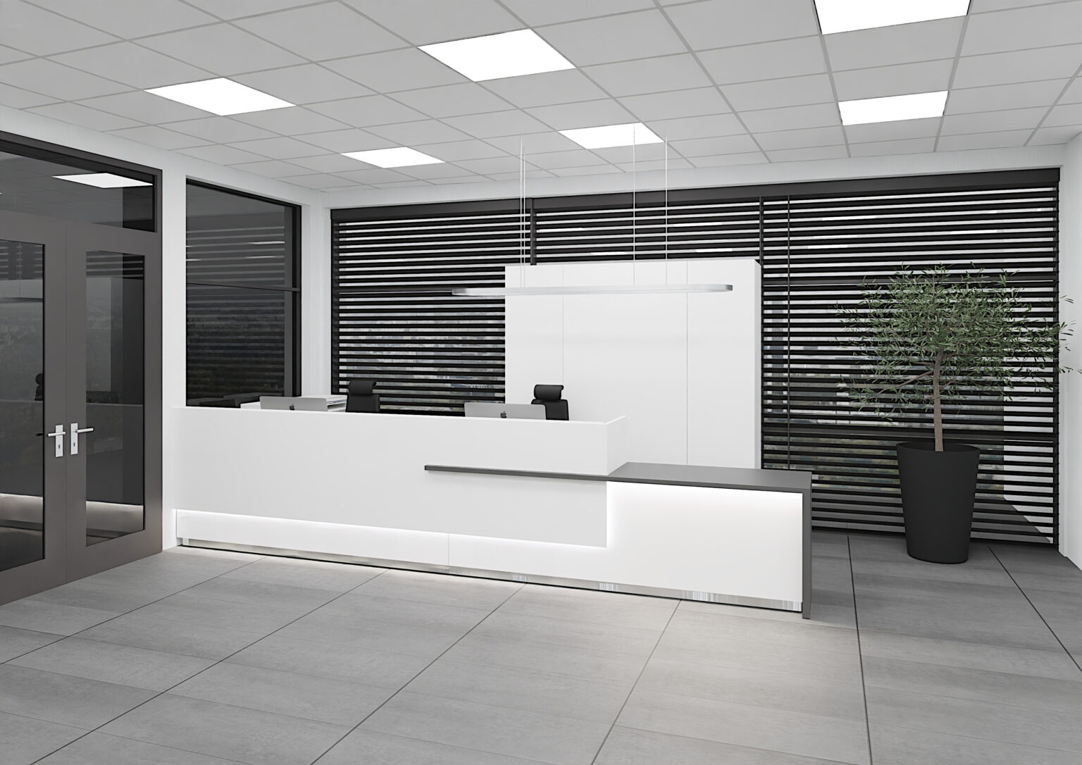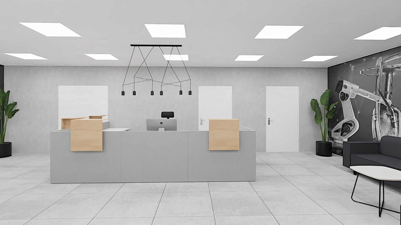 Recepcja to kluczowy element biura — jej design musi być spójny z identyfikacją wizualną firmy, kolorystyką, materiałami i stylem. Dobre pierwsze wrażenie buduje zaufanie.