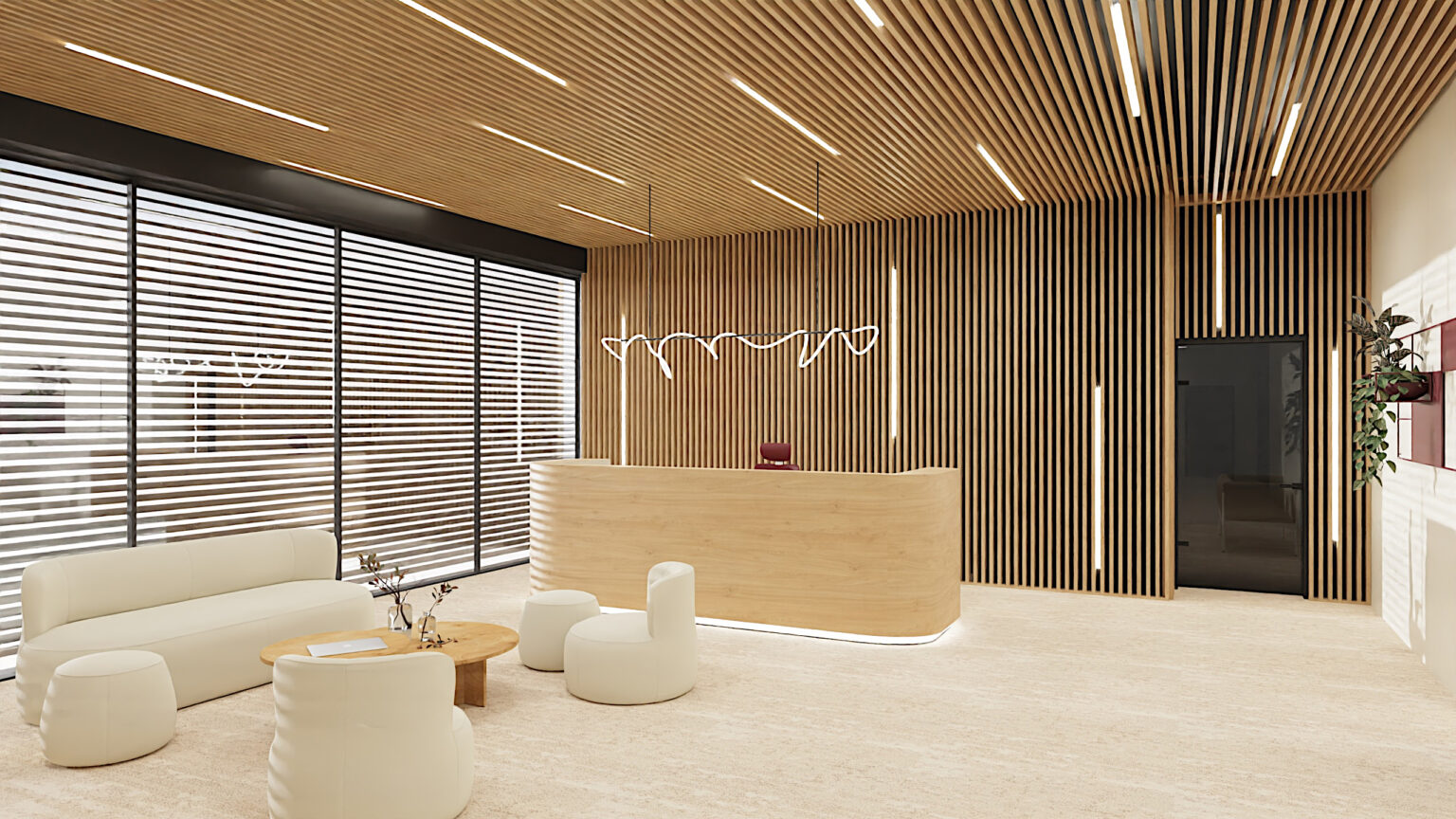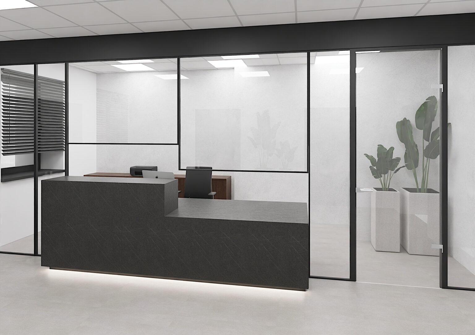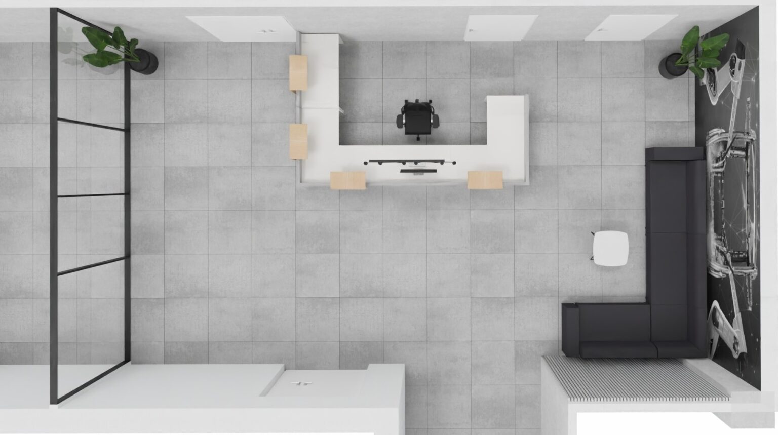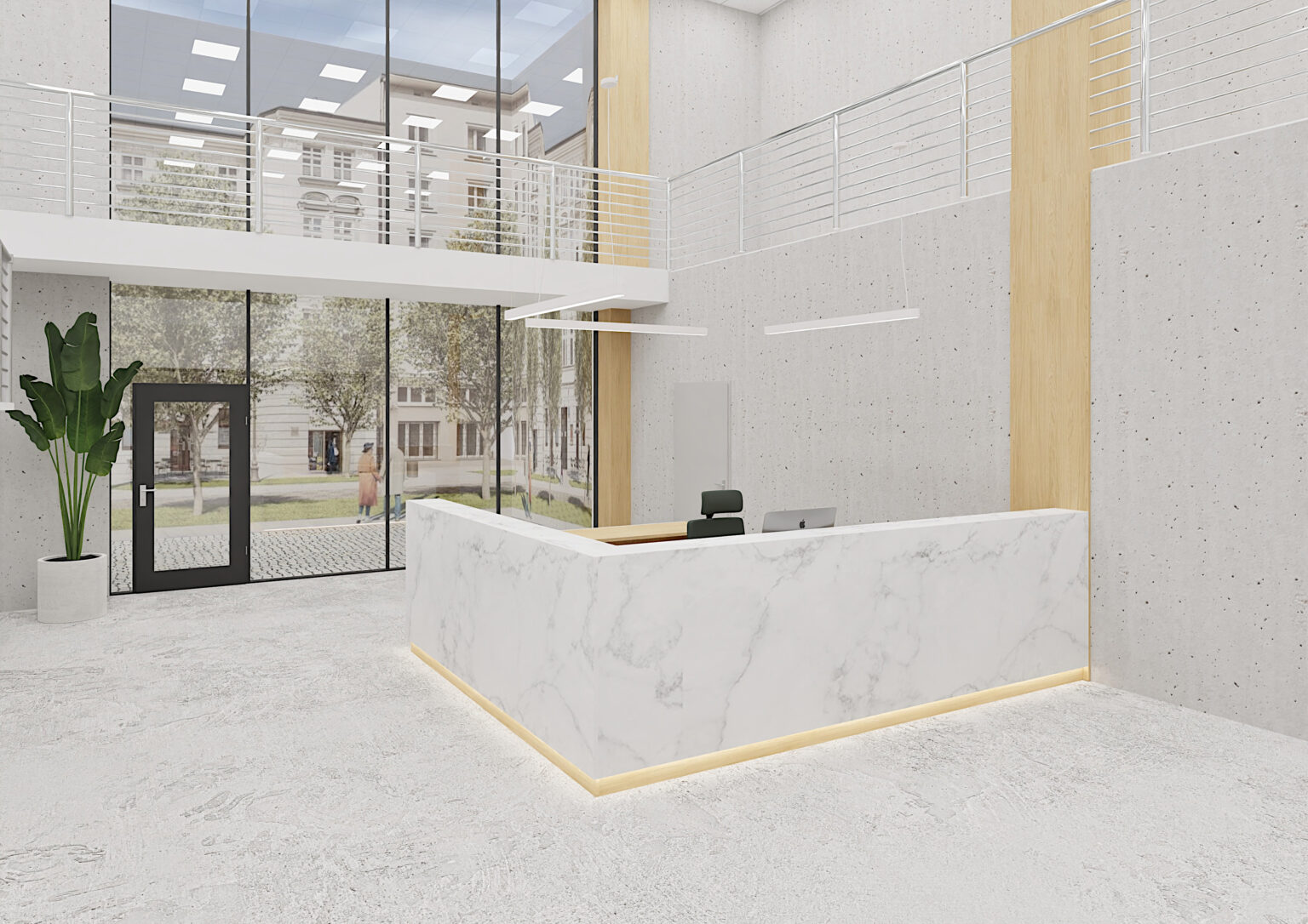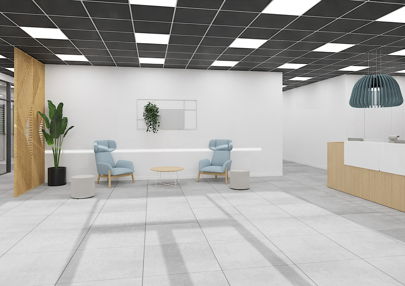 Recepcja to kluczowy element biura — jej design musi być spójny z identyfikacją wizualną firmy, kolorystyką, materiałami i stylem. Dobre pierwsze wrażenie buduje zaufanie.