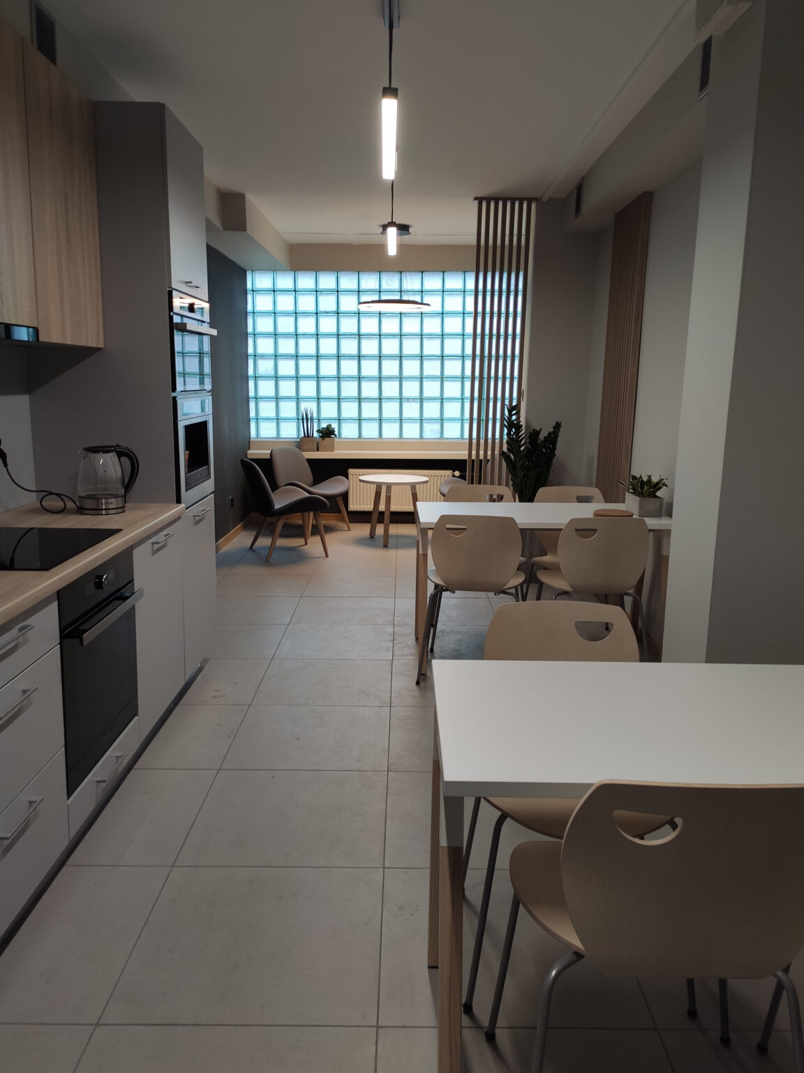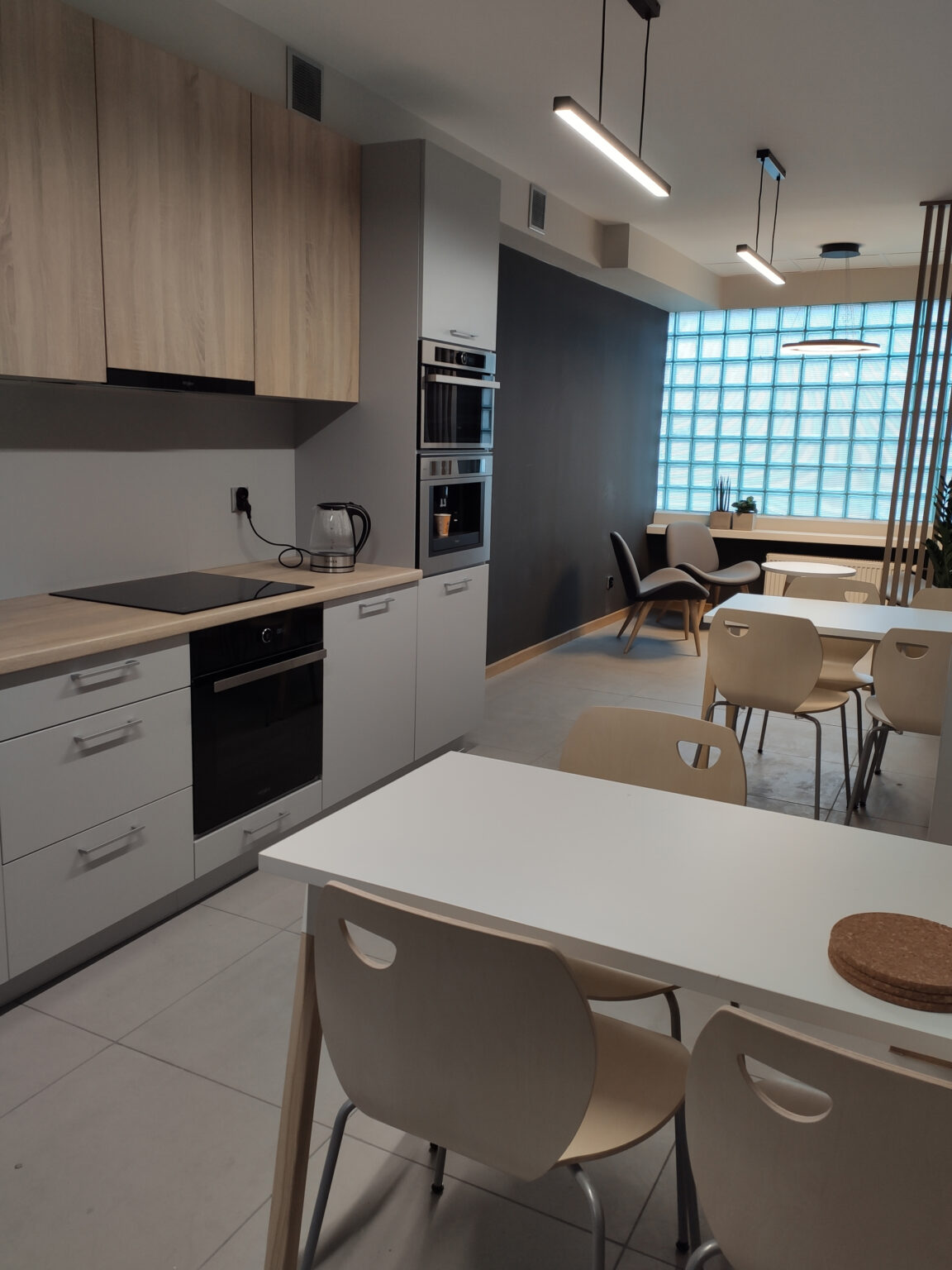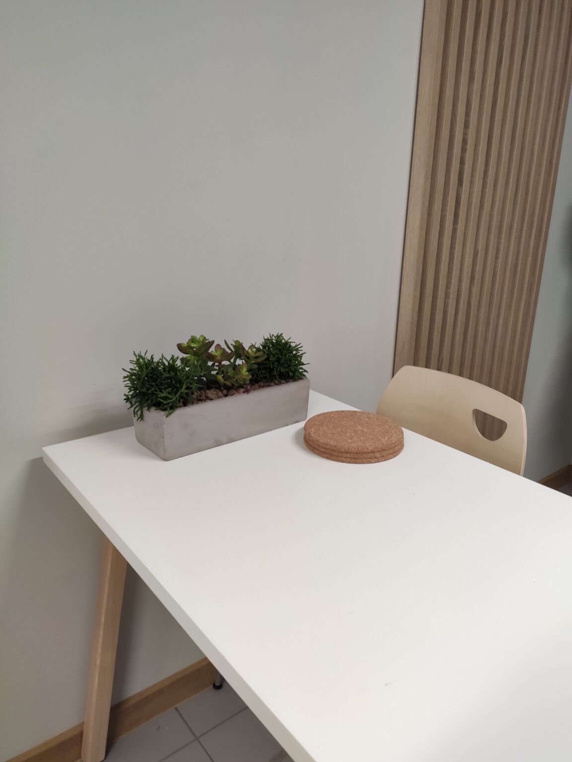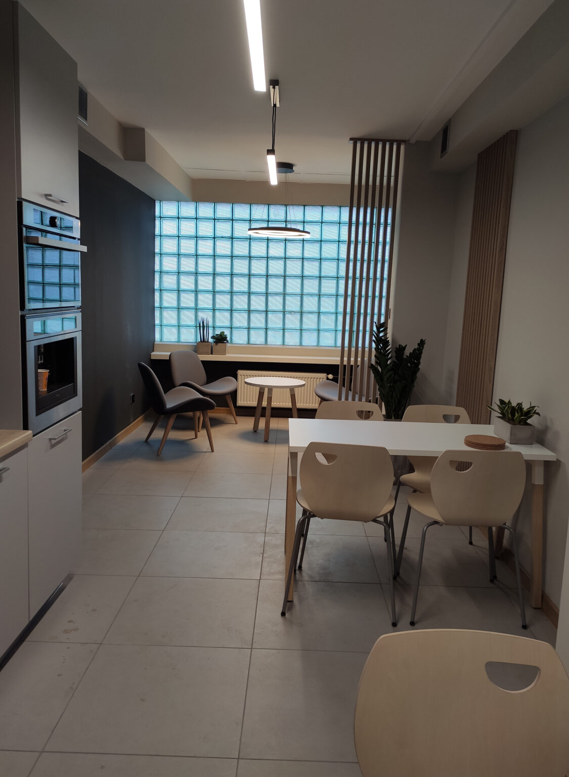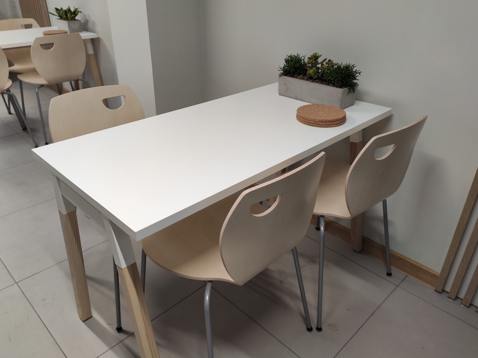 Kantyna zaprojektowana w nowoczesnym i minimalistycznym stylu – łączy funkcjonalność z elegancją. Pomieszczenie utrzymane jest w stonowanych kolorach bieli, szarości i drewna, co tworzy spokojną i neutralną atmosferę. W części jadalnianej postawiliśmy na proste stoły, zestawione z lekkimi, drewnianymi krzesłami, które idealnie komponują się z lamelami, tworząc spójną i harmonijną całość. Zadbaliśmy też o strefę relaksu oraz żywe dekoracje – kwiaty w stylowych, betonowych donicach.