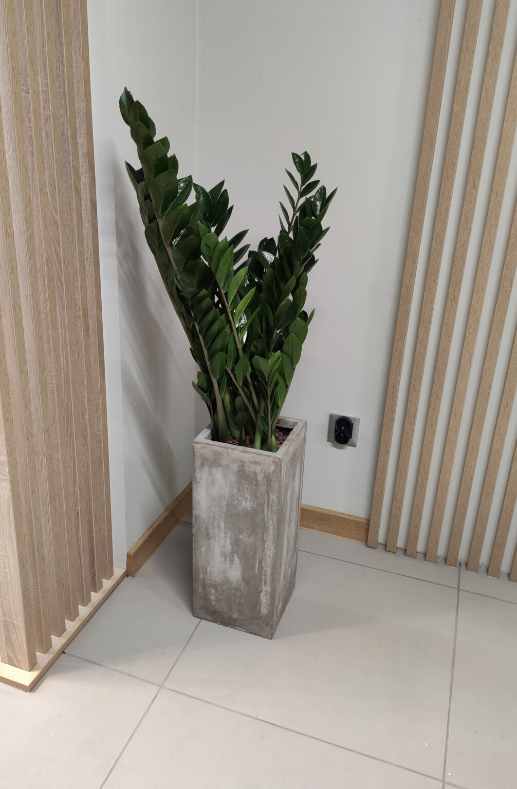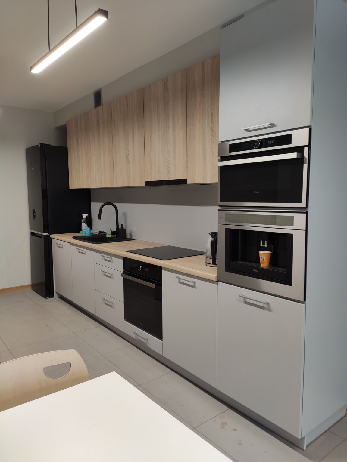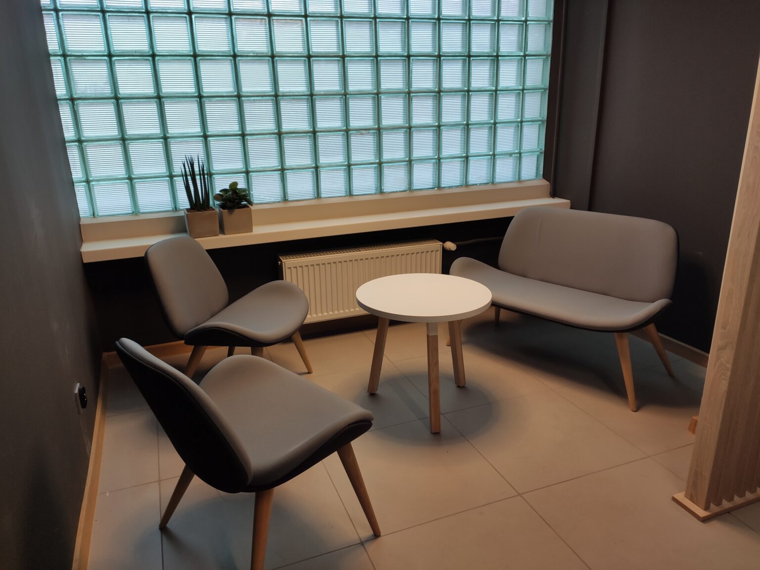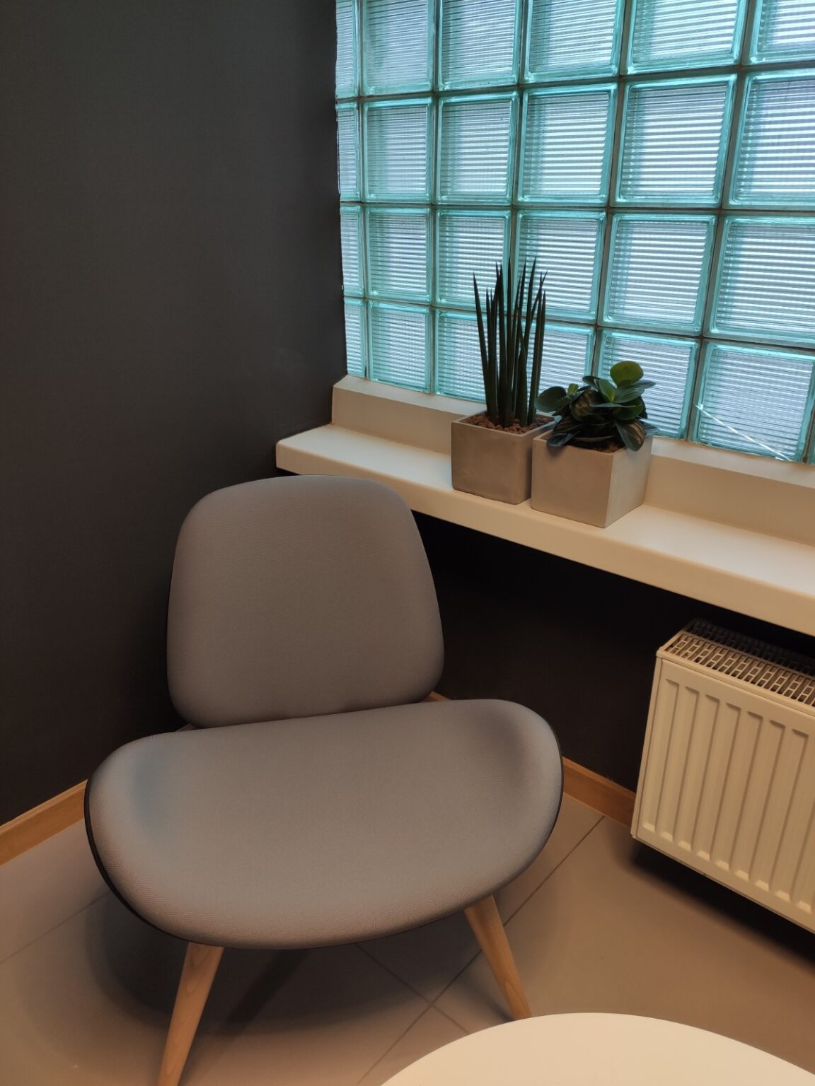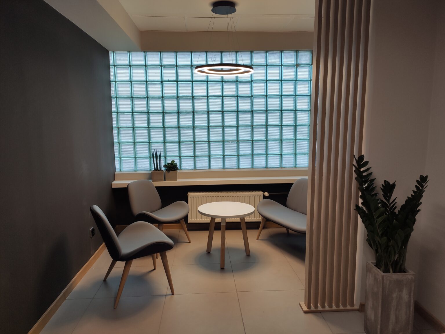 Kantyna zaprojektowana w nowoczesnym i minimalistycznym stylu – łączy funkcjonalność z elegancją. Pomieszczenie utrzymane jest w stonowanych kolorach bieli, szarości i drewna, co tworzy spokojną i neutralną atmosferę. W części jadalnianej postawiliśmy na proste stoły, zestawione z lekkimi, drewnianymi krzesłami, które idealnie komponują się z lamelami, tworząc spójną i harmonijną całość. Zadbaliśmy też o strefę relaksu oraz żywe dekoracje – kwiaty w stylowych, betonowych donicach.