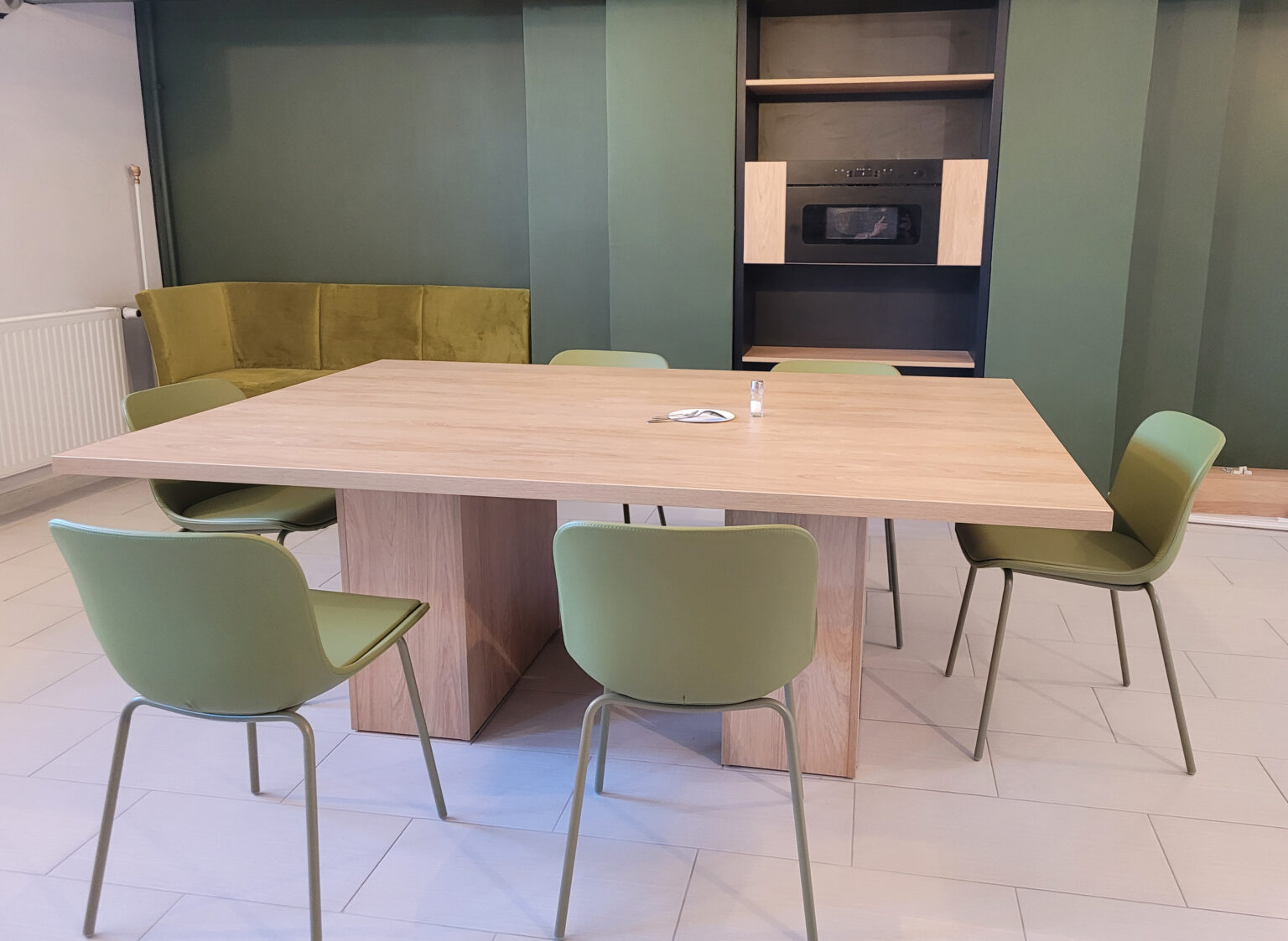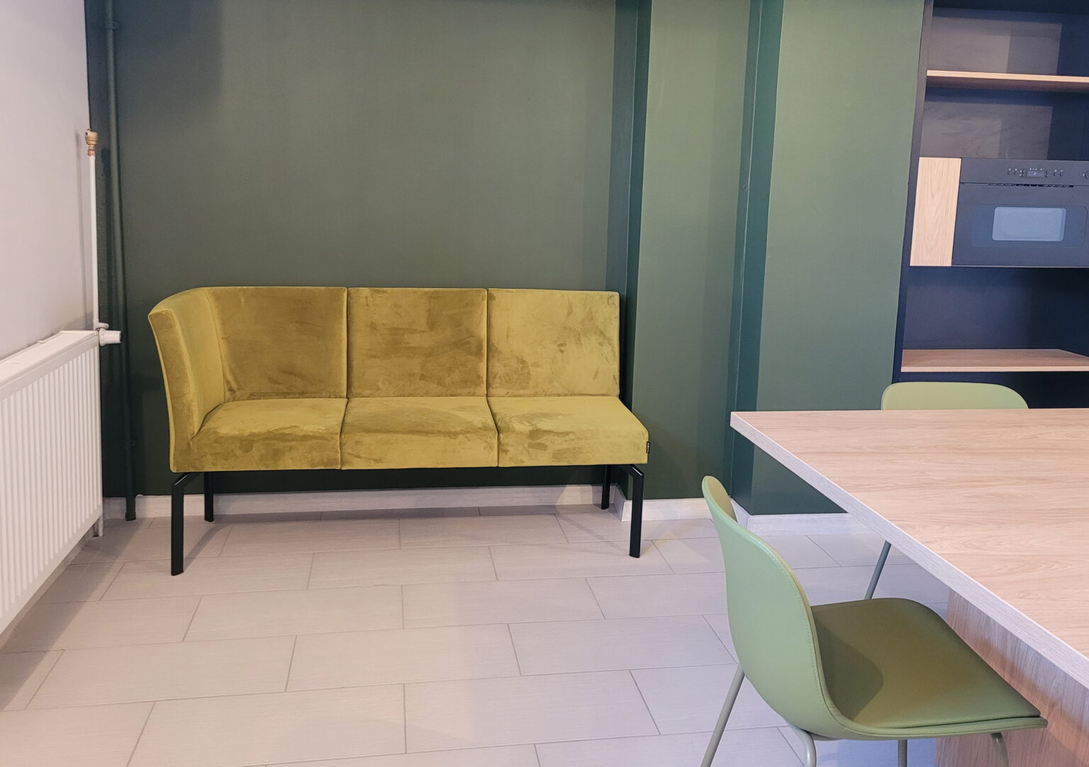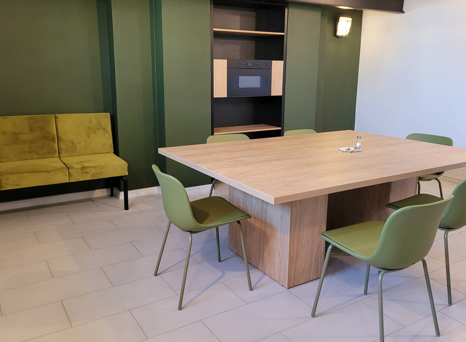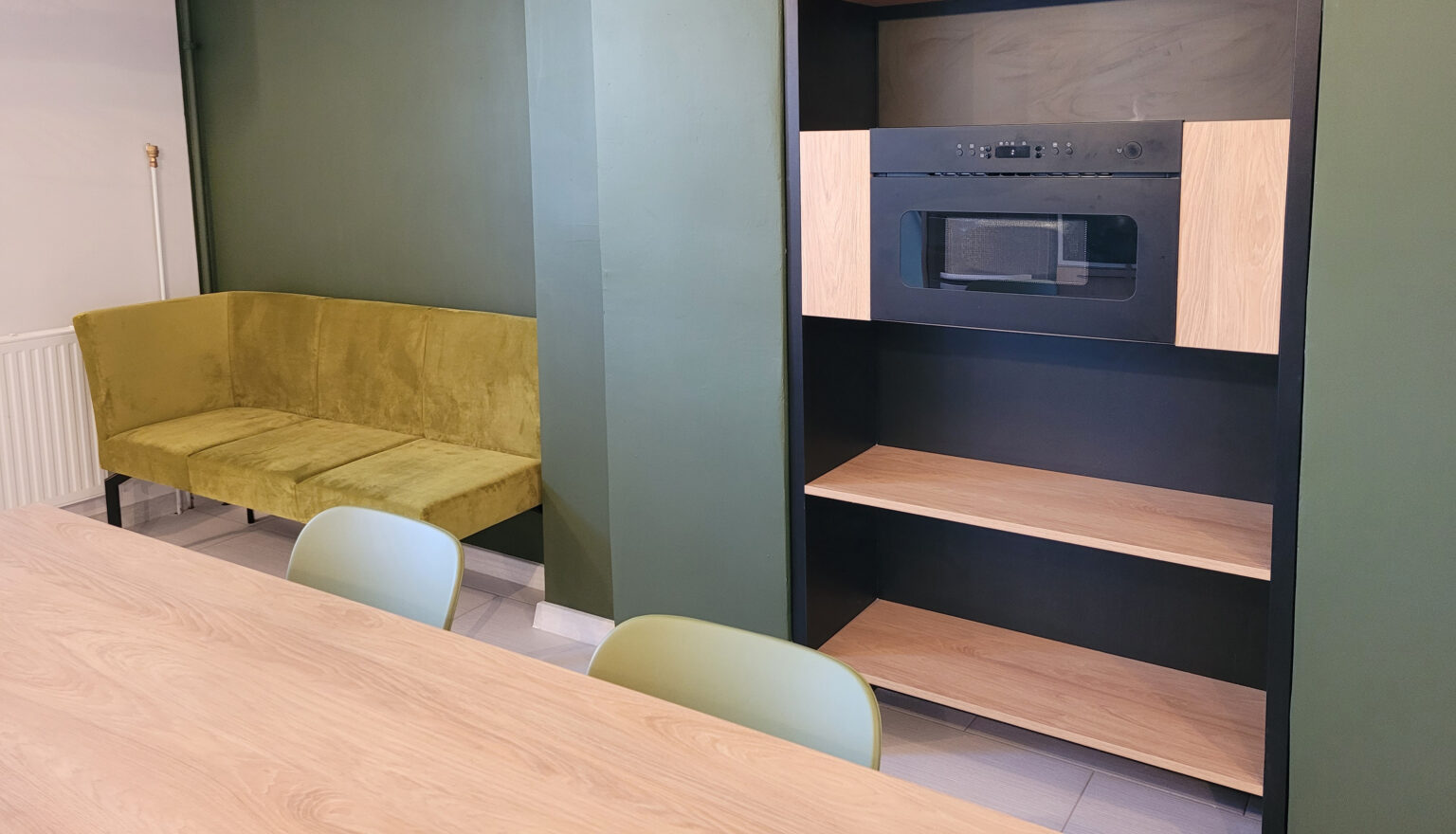 Kantyna łącząca w sobie funkcjonalność z nowoczesnym, industrialnym stylem. Dominującym elementem jest aneks kuchenny, w którym dolne szafki w matowym, oliwkowym odcieniu zieleni zestawiono z górnymi szafkami o wykończeniu w jasnym drewnie. Pomiędzy nimi zastosowano ceramiczną mozaikę. W centralnej części pomieszczenia stoi duży, kwadratowy stół, również w jasnym drewnie, otoczony krzesłami o nowoczesnym designie, w oliwkowym kolorze. Całość dopełnia wygodna kanapa oraz półki we wnęce ściennej. Odsłonięte, czarne belki stropowe oraz minimalistyczne oświetlenie, nadają przestrzeni surowego, industrialnego uroku.