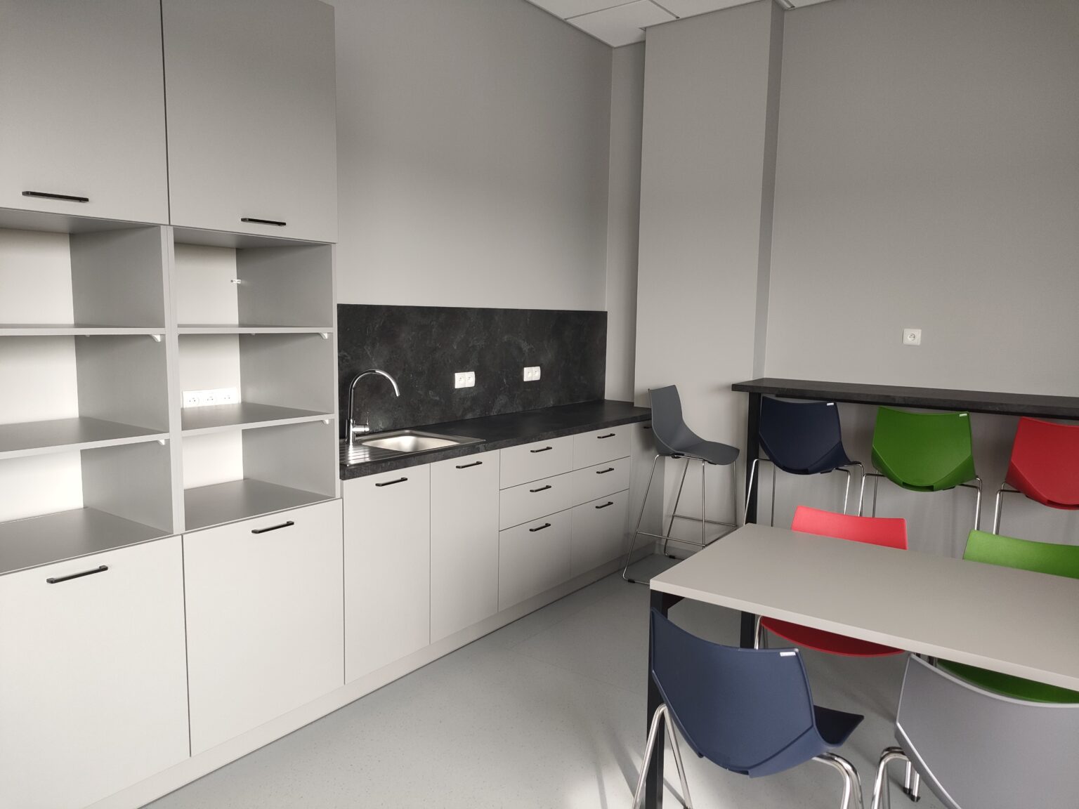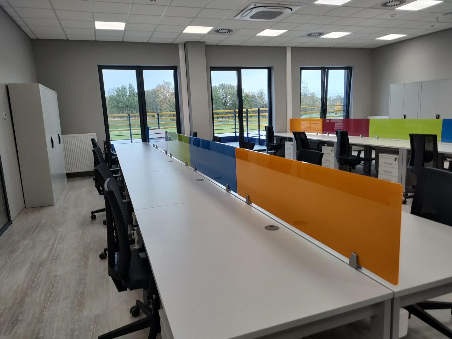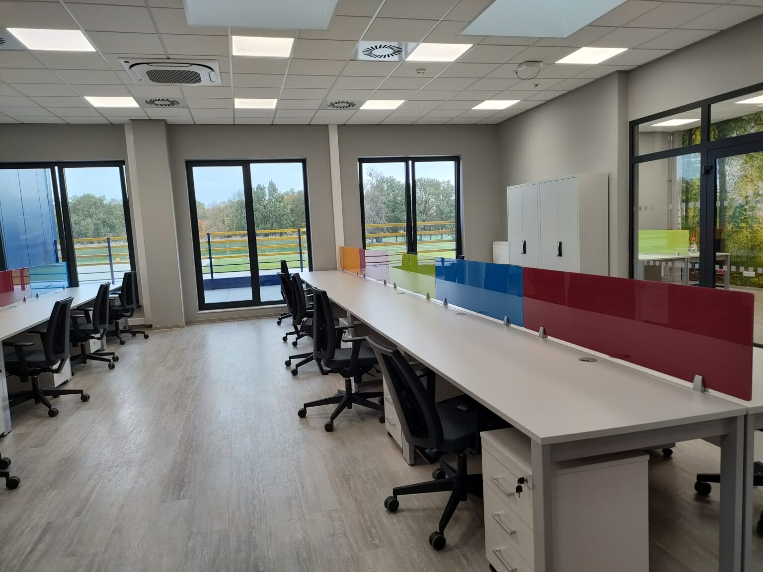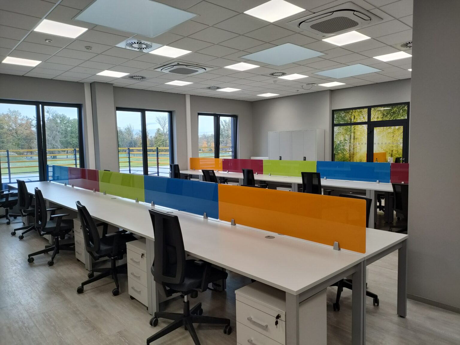 Ergonomiczny openspace, który wspiera zarówno pracę indywidualną, jak i zespołową. Wnętrze łączy stonowaną kolorystykę z dynamicznymi akcentami: kolorowe przegrody akustyczne na biurkach nie tylko dodają designu, ale i zwiększają komfort pracy. Przestrzeń wyposażono w wygodne blaty robocze, fotele obrotowe i mobilne kontenery, zapewniające pracownikom swobodę i funkcjonalność. Fototapeta z motywem leśnym dodaje unikalnego charakteru.