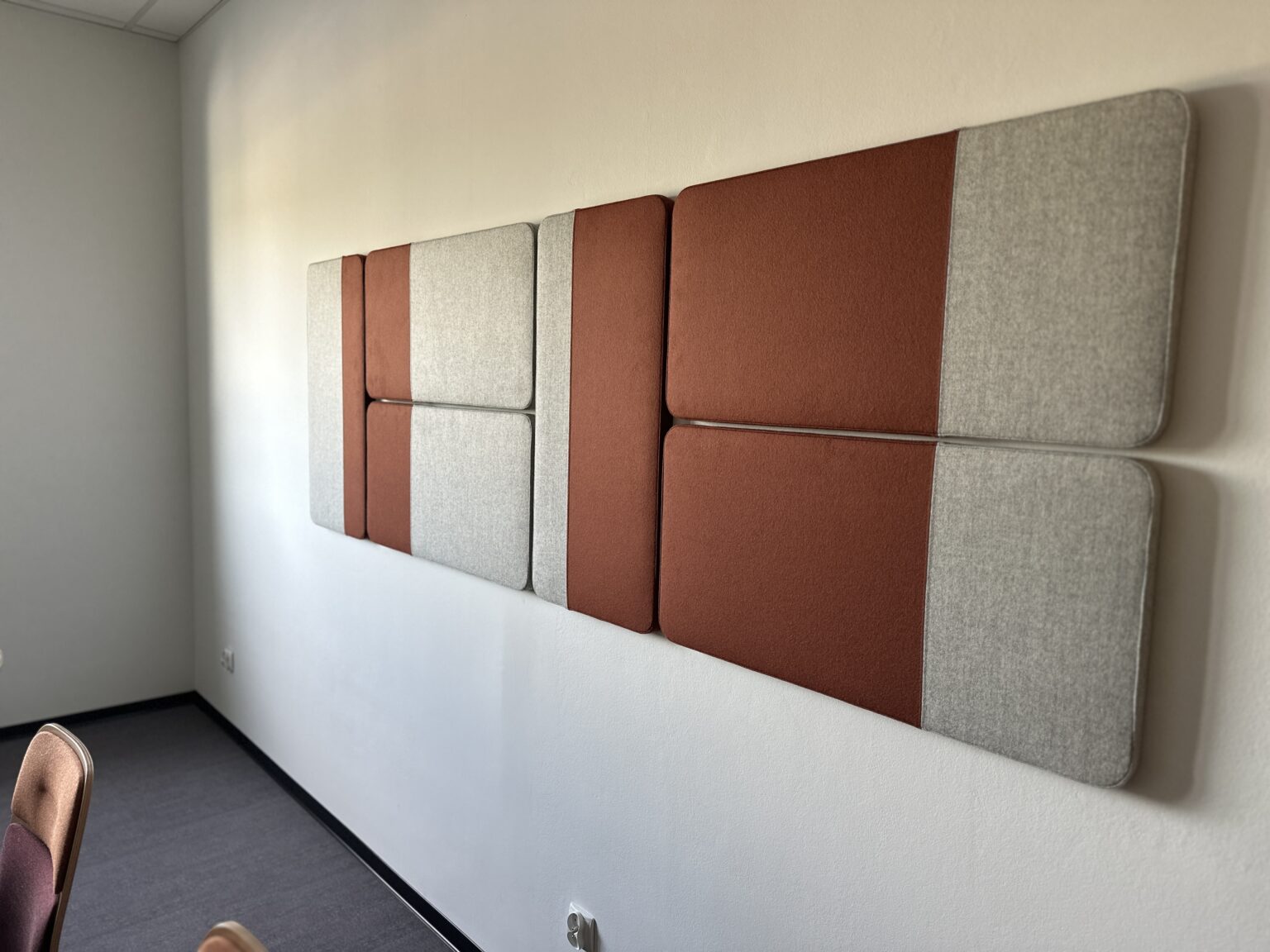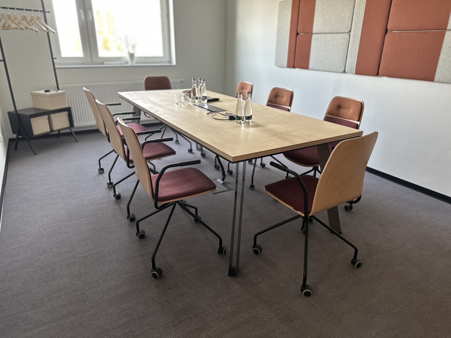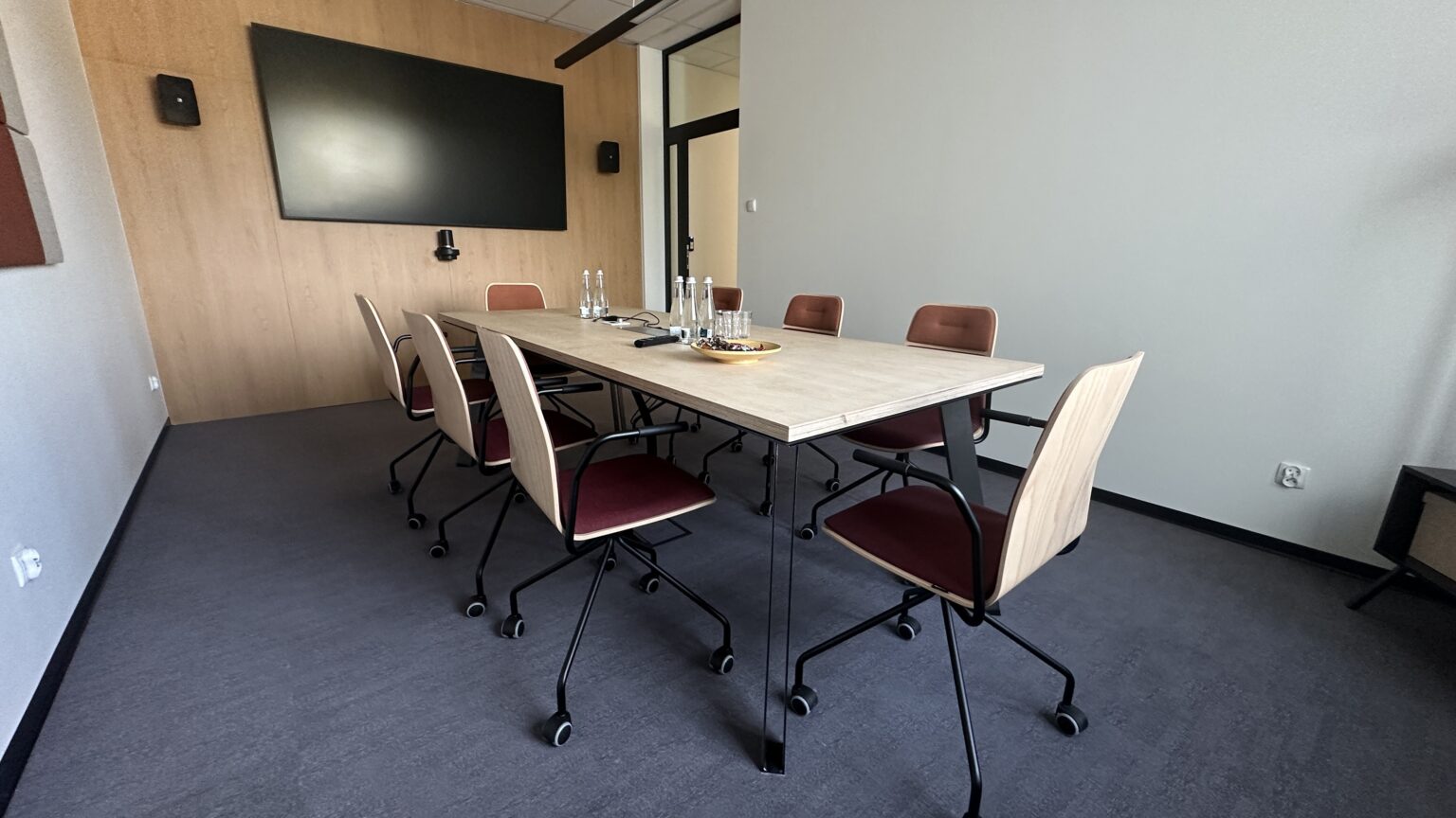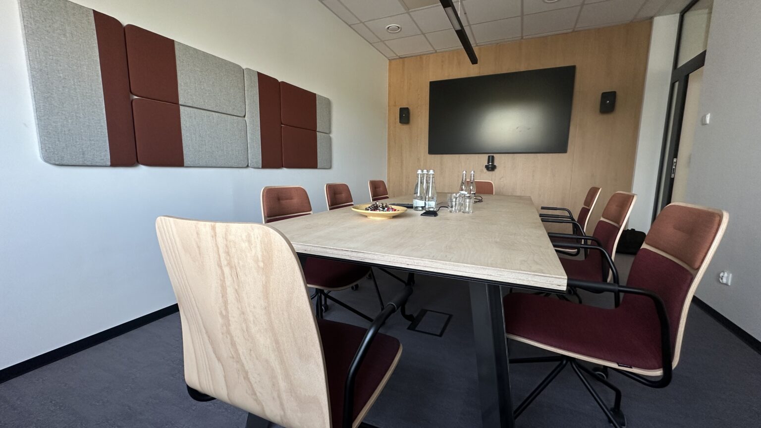 Sala spotkań została zaprojektowana z myślą o efektywnej komunikacji i komforcie uczestników, łącząca design z funkcjonalnością. Długi stół z jasnym blatem i minimalistyczną podstawą jest idealny do pracy zespołowej i szkoleń. Na ścianie umieszczono panele akustyczne, które nie tylko stanowią ciekawy akcent dekoracyjny, ale także doskonale izolują dźwięk. Wnętrze, utrzymane w neutralnych odcieniach, tworzy profesjonalne i spokojne tło dla kluczowych rozmów biznesowych.