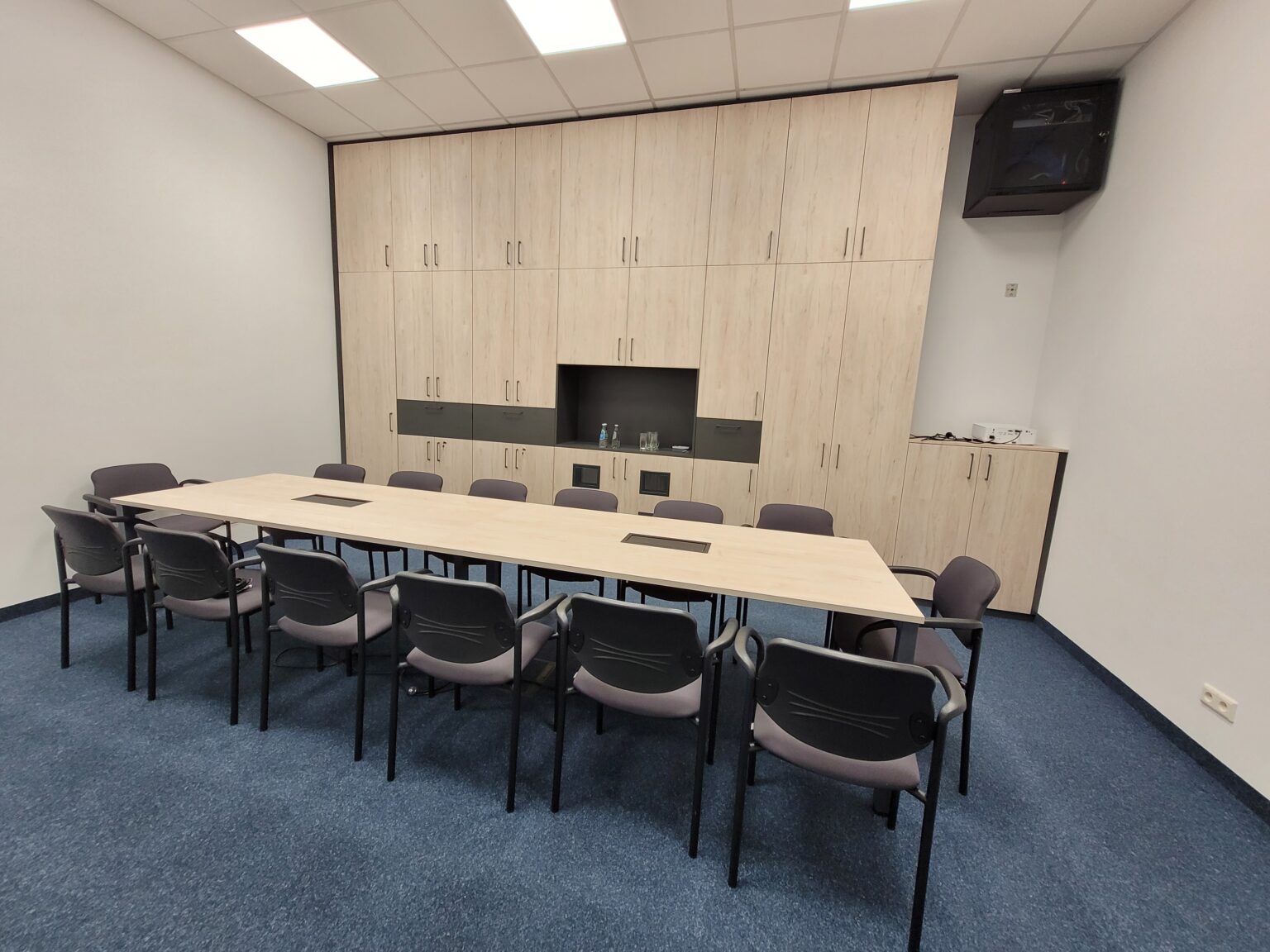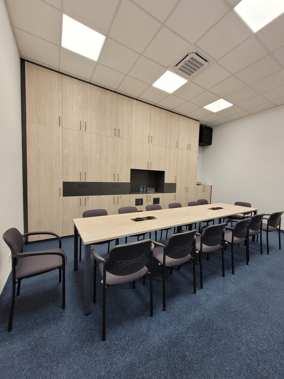 Funkcjonalna sala konferencyjna, idealna do spotkań, szkoleń i prezentacji. Dominantą wnętrza jest pojemna, modułowa zabudowa meblowa, która zapewnia maksymalną przestrzeń do przechowywania i utrzymania porządku. W centrum znajduje się duży stół konferencyjny z wbudowanymi mediaportami, gwarantujący wygodne korzystanie ze sprzętu. Dzięki neutralnej kolorystyce i dobrze rozplanowanemu oświetleniu, sala tworzy profesjonalne i sprzyjające koncentracji środowisko. Projekt łączy estetykę z praktycznością, odpowiadając na potrzeby nowoczesnego biznesu.