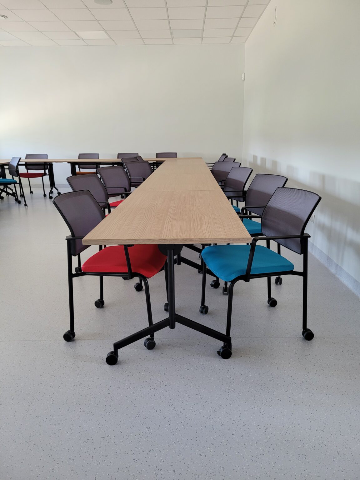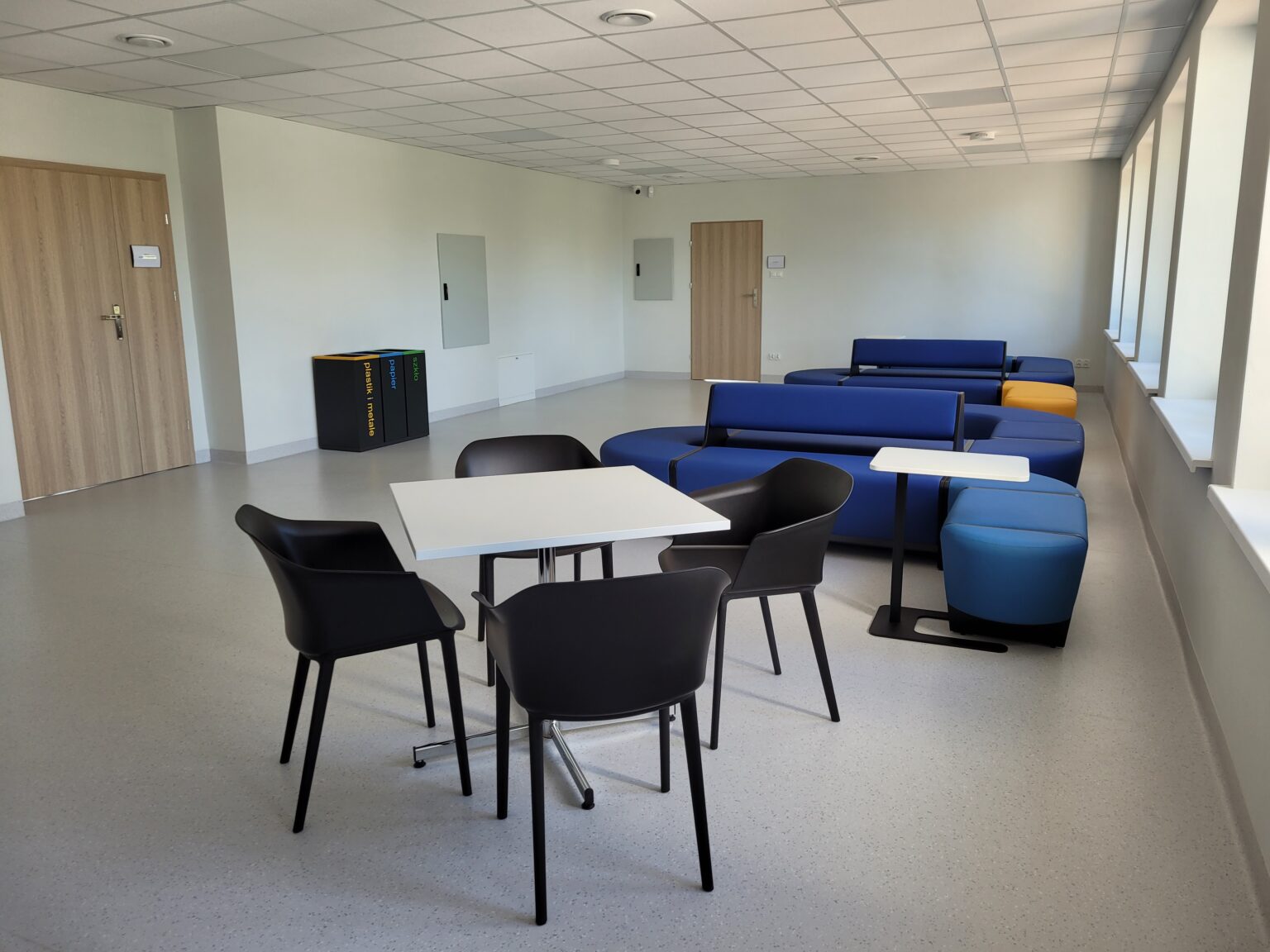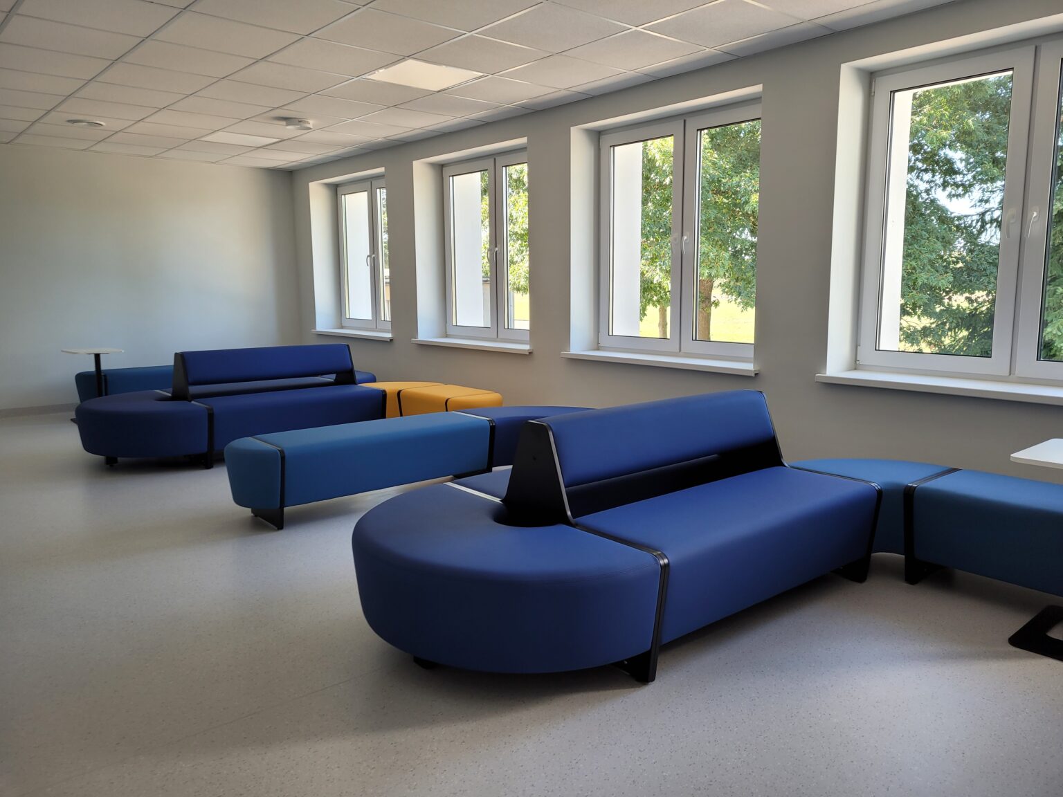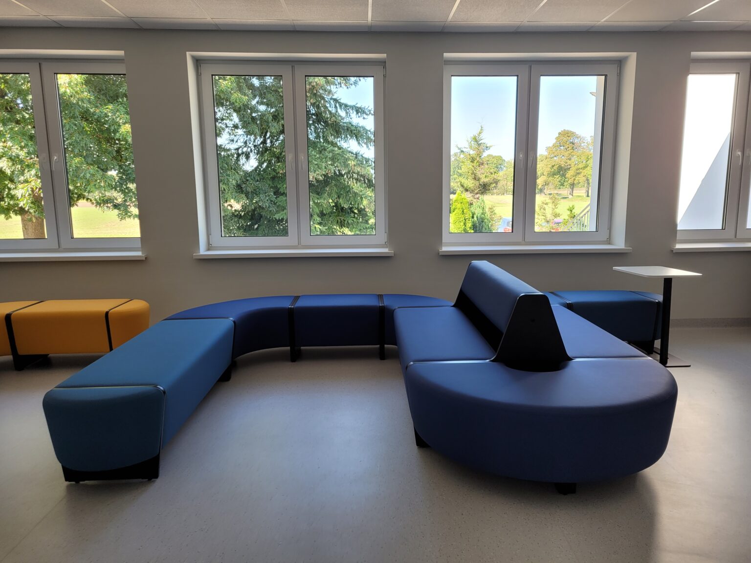 Szkolne wnętrza zostały wyposażone w modułowe, mobilne meble, tak aby można było łatwo je dopasować do różnych potrzeb. W salach lekcyjnych zastosowano wygodne biurka (w tym na kółkach), które można swobodnie przestawiać, tworząc różne układy. Dopełnieniem są ergonomiczne krzesła i fotele. Nie zapomnieliśmy również o przechowywaniu – postawiliśmy na kontenerki podbiurkowe oraz duże, pojemne szafy, w kolorystyce blatów. W strefie wypoczynkowej, zastosowaliśmy modułowe sofy, które wspierają integrację uczniów i pracę w podgrupach oraz pozwalają się zrelaksować między lekcjami. Zadbaliśmy również o wyposażenie uzupełniające: wieszaki, kosze na śmieci, tablice, stoliki boczne czy regały.