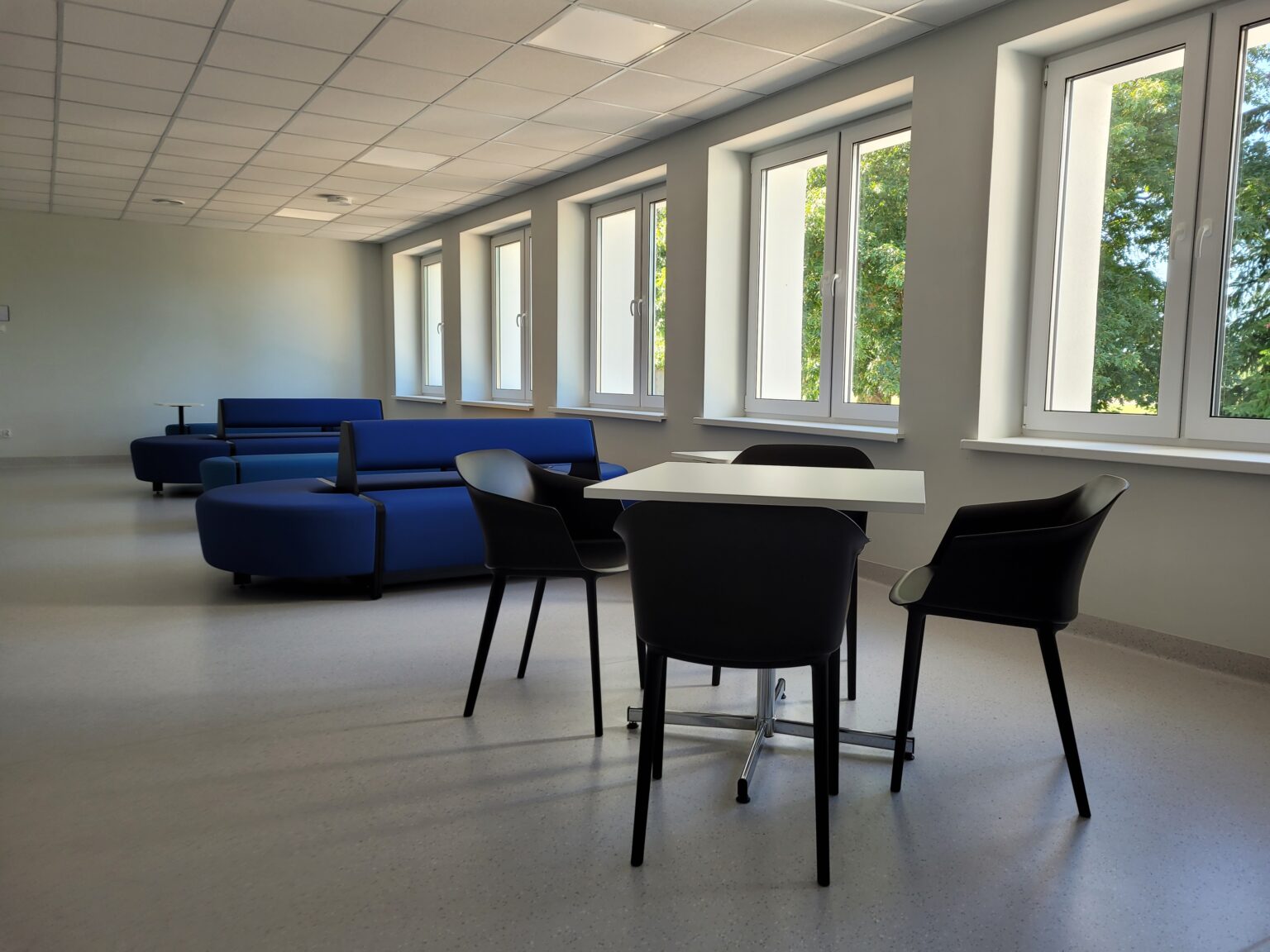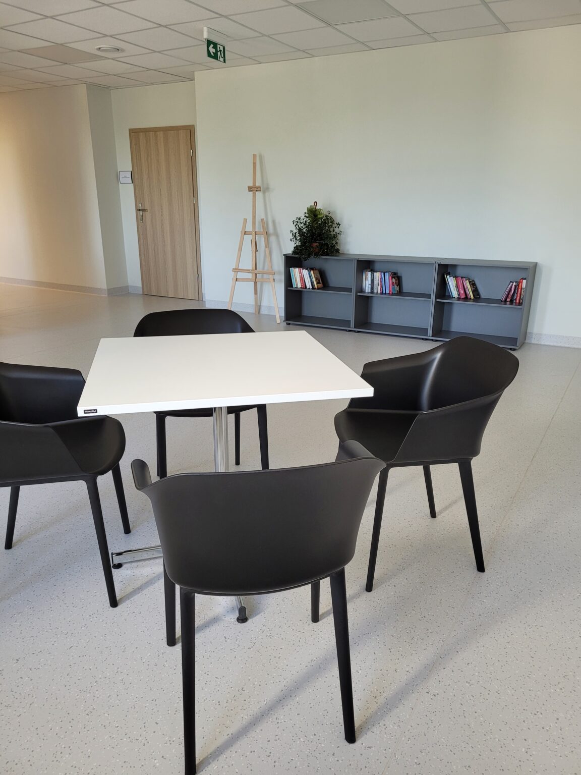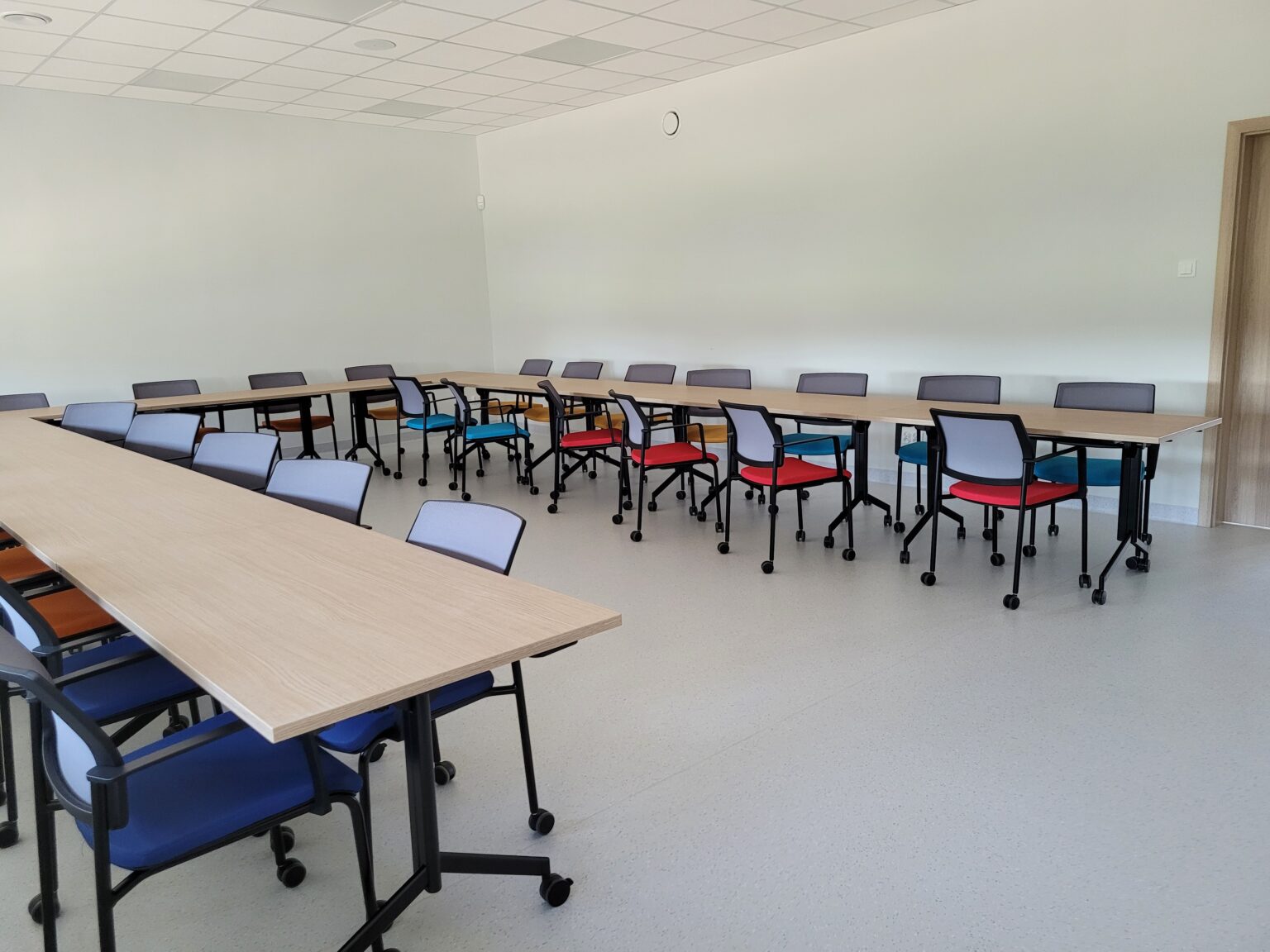 Szkolne wnętrza zostały wyposażone w modułowe, mobilne meble, tak aby można było łatwo je dopasować do różnych potrzeb. W salach lekcyjnych zastosowano wygodne biurka (w tym na kółkach), które można swobodnie przestawiać, tworząc różne układy. Dopełnieniem są ergonomiczne krzesła i fotele. Nie zapomnieliśmy również o przechowywaniu – postawiliśmy na kontenerki podbiurkowe oraz duże, pojemne szafy, w kolorystyce blatów. W strefie wypoczynkowej, zastosowaliśmy modułowe sofy, które wspierają integrację uczniów i pracę w podgrupach oraz pozwalają się zrelaksować między lekcjami. Zadbaliśmy również o wyposażenie uzupełniające: wieszaki, kosze na śmieci, tablice, stoliki boczne czy regały.